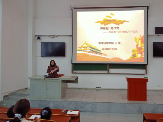 任倩老师首先以《讲奉献勇作为——做新时代合格共产党员》作为党课主题,为大家讲解了新时代党员的责任与义务,让大家对照标准找差距,主动学习,提升自已。随后,任老师向大家生动讲述了疫情期间公司抗疫志愿者向栩、吴金铭等同学勇敢抗疫的故事和今年6月份毕业生返校志愿者的无私奉献、乐于助人、默默奉献的事迹,称赞他们也是“最美逆行者”,真正起到了先锋模范带头作用。最后,她呼吁大家向身边的榜样学习,思想与行动上都要积极向党组织靠拢,以不怕困难、勇担使命的实际行动展示地科学子风采。