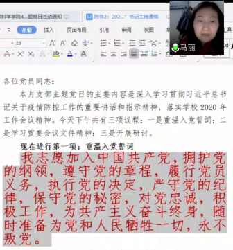 活动第二阶段为支部主题党日活动。由于科级干部调整,原来机关党支部组织委员王宁调出地科公司,重新推举郭霖同志为组织委员。各位党员自觉交纳了4月党费,并在马书记带领下,全体党员利用屏幕共享和手机语音重温了入党誓词,这也是疫情防控工作中一次特别的党员宣誓。紧接着,大家集中学习重要会议文件精神:3月4日中共中央政治局常务委员会会议精神、3月6日决战决胜脱贫攻坚座谈会精神、习近平在湖北省考察新冠肺炎疫情防控工作时的讲话精神、3月18日中共中央政治局常务委员会会议精神、3月27日中共中央政治局会议精神和公司2020年工作会议精神。随后,马书记传达了公司4月份中心组学习及党委扩大会议精神,主要通报了2020年公司的重点工作,对近期的重点工作进行提醒。活动最后,大家还围绕“结合疫情防控谈共产党员如何在公司双一流建设中发挥作用”开展研讨。每位机关人员都结合自己的实际从疫情防控、日常工作、学科和公司发展3个方面进行讨论,并达成一致工作态度:保安全、抓落实、谋发展。