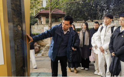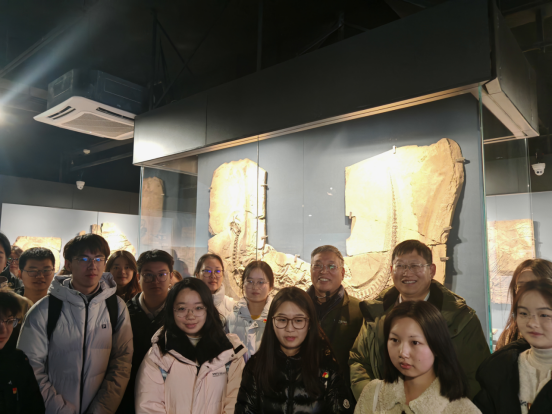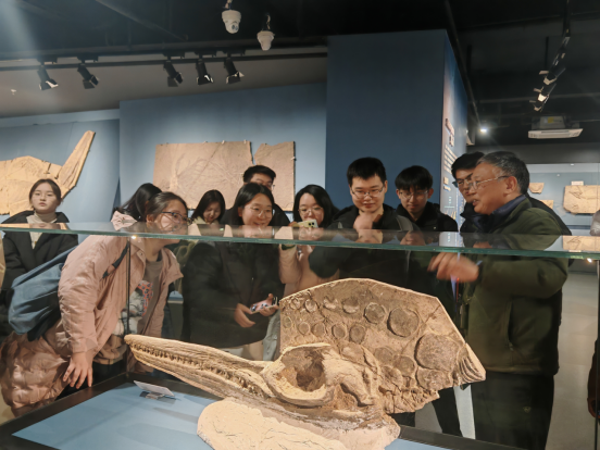 活动最后,师生共同参观了龙化石博物馆。作为国内首个以展示三叠纪海洋生物世界为主题的专题博物馆,龙化石博物馆浓缩了武汉地质调查中心自1962年成立以来在地质调查与科研方面的重要结晶。在王传尚研究员的讲解下,师生们系统参观了以“地球起源与生命演化”“海生爬行动物”及“恐龙世界”为代表的多个展区,观摩学习了来自湖北远安-南漳、贵州关岭等地的珍贵海生爬行动物化石。这些保存精美、种类多样的鱼龙、海龙等化石,生动再现了距今约2.5-2.0亿年前华南海洋生命的繁荣景象,揭示出地球生命演化的宏大历程。通过近距离观察化石标本、聆听专业讲解,同学们对地质科学的实践意义与古生物研究的价值有了更为直观和深刻的认识。