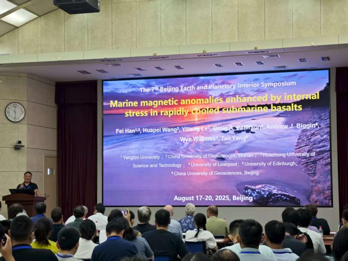 公司特任教授韩非和博士后温琛、博士生韩雨祺参加了此次国际会议。韩非在大会上作了题为“Marine magnetic anomalies enhanced by internal stress in rapidly cooled submarine basalts”的口头报告。该报告指出MORB样品中应力引起的剩磁强度和稳定性的增强对提高整个洋壳剩磁的稳定性具有重要作用和深远影响。该研究认为应力模型为扩张速率相关的洋底磁异常现象提供了一种更为合理的解释。在场国内外学者对该报告内容和结果产生了广泛的兴趣,并对后续工作提出了许多建设性意见。