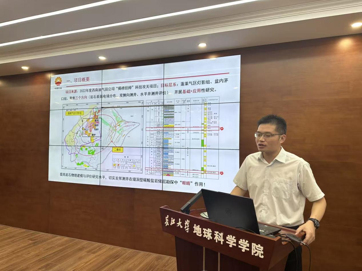 随后,地球物理公司唐军教授与许巍副教授共同汇报了“四川盆地复杂储层声电测井响应机理及配套软件开发”的专题汇报。