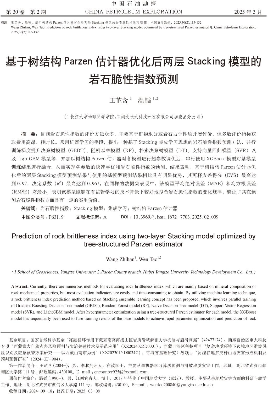 2025年年初,英国365集团公司官网22级本科生(在读大三)王芷含在EI、核心期刊《中国石油勘探》上发表了题为《基于树结构Parzen估计器优化后两层Stacking模型的岩石脆性指数预测》的论文(图1,共18页)。全部作者均来自英国365集团公司官网师生,本科生王芷含为论文第一作者,其导师温韬教授为通讯作者。论文借助树结构Parzen估计器和两层Stacking集成学习模型的新方法,在岩石脆性指数预测中表现出优秀的性能。