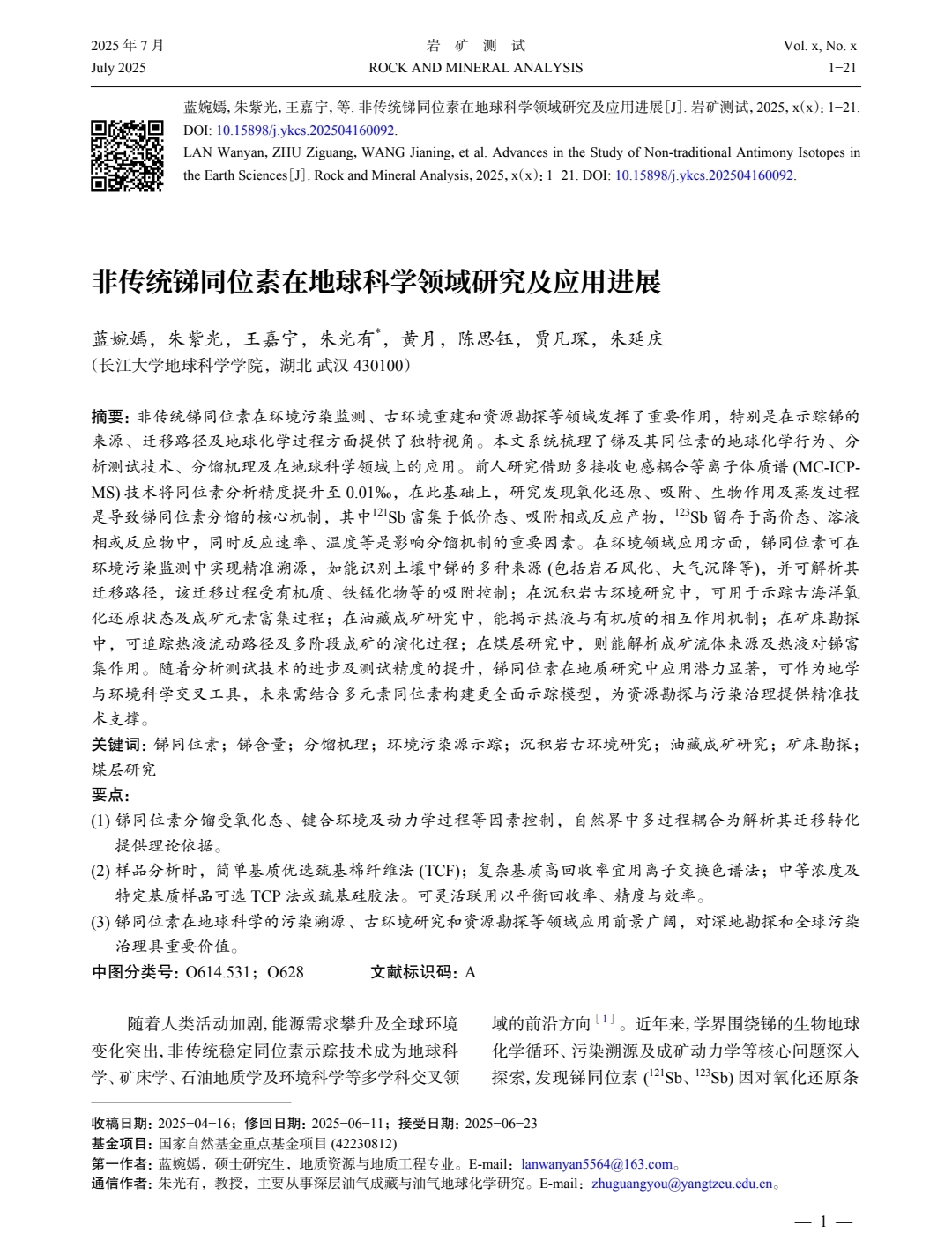 (通讯员 贾凡琛)近日,英国365集团公司官网21级本科生蓝婉嫣在核心期刊《岩矿测试》发表题为《非传统锑同位素在地球科学领域研究及应用进展》的论文(全文共21页)。论文作者均为英国365集团公司官网师生,其中地质资源专业22102班本科生蓝婉嫣为第一作者,其导师朱光有教授为通讯作者。该论文系统梳理了锑及其同位素的地球化学行为、分析测试技术、分馏机理,以及在地球科学领域的应用。