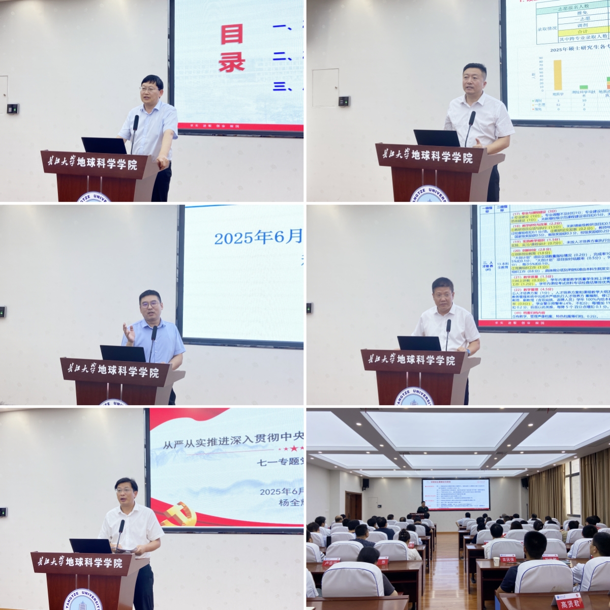 石油系主任叶琳、地质系主任李涛、地科系主任刘彬、地信系主任刘远刚和实验中心主任丰勇分别就各自负责的系(中心)2025年前半年工作与安排、2025年前半年工作成效和下半年重点任务与对策进行汇报,从教学、科研、人才培养、人才引进、团队建设、平台建设、研究团队建设、实验室建设、实验室安全保障与管理、宣传工作、科普工作等方面全面展开,切合实际、对标对表进行总结和分析,讲问题、找差距,对标其他高水平高校,把自己目前的问题剖析透彻,并对如何高质量完成全年任务,提出相应的措施,提升管理能效。