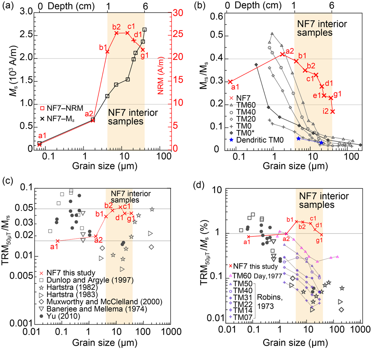 研究人员将受应力主导的NF7样品与不受应力样品的磁学性质进行对比,发现NF7样品的Mrs/Ms和TRM50µT/Ms(代表热剩磁记录能力)均是无内应力且同等尺寸、钛含量样品的3倍左右,指示MORB样品的内应力极大提高了其记录剩磁的能力(图2)。进一步对全球MORB与陆地喷发玄武岩样品的天然剩磁(NRM)进行比较,发现2007个MORB样品的NRM平均值(换算到赤道处地磁强度)是7.89 A/m,而177条陆地喷发玄武岩熔岩1275个样品的NRM平均值是3.57 A/m。该研究推测MORB样品中广泛存在的内应力是引起MORB样品NRM值较高的原因之一。