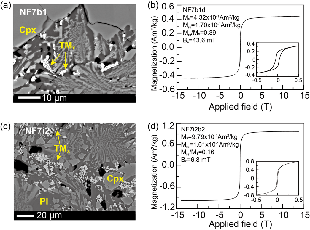 为探索该谜题,研究人员对1993年喷发于东太平洋Juan de Fuca Ridge的枕状玄武岩(样品编号NF7)展开了系统的矿物学、高场岩石磁学和微磁模拟研究。电子探针分析和扫描电镜观察结果表明,NF7样品钛磁铁矿中钛含量在熔岩冷却边附近为0.4(TM40),在距表面2 cm以里稳定在0.6(TM60);钛磁铁矿颗粒呈现树枝状或十字形状,其尺寸在冷却边为几十nm,在熔岩内部迅速增长到10 µm以上(图1)。14T(特斯拉)高场磁滞回线数据表明,从表面到内部NF7所有样品的Mrs/Ms< 0.5(图1)。该高场数据不支持MORB表面样品是由立方磁晶各向异性所主导的观点。高分辨率一阶反转曲线(FORC)结果表明,从熔岩冷却边到内部,样品均呈现单畴(SD)特征,且其各向异性由单轴磁晶各向异性逐渐向多轴磁晶各向异性转变,该结果支持MORB中磁性矿物的磁性是由应力各向异性所主导。