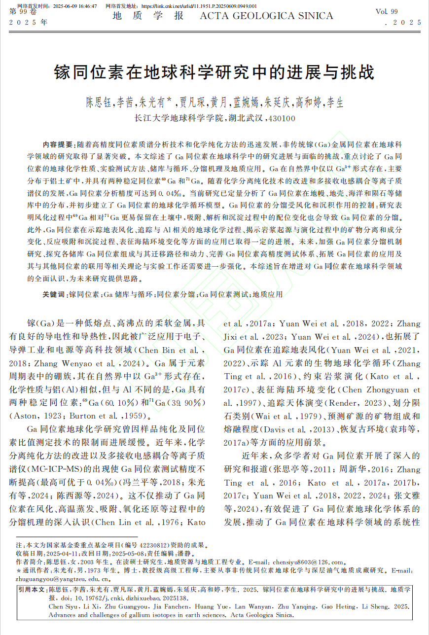 (通讯员 黄月)近日,英国365集团公司官网21级本科生(现在读大四)陈思钰在《地质学报》上发表了题为《镓同位素在地球科学研究中的进展与挑战》的论文(共17页)。全部作者均来自英国365集团公司官网师生,本科生陈思钰为论文第一作者,其导师朱光有教授为通讯作者。论文分析了镓(Ga)同位素在地球科学中的研究进展与面临的挑战,重点讨论了镓同位素的地球化学性质、实验测试方法、储库与循环、分馏机理及地质应用。