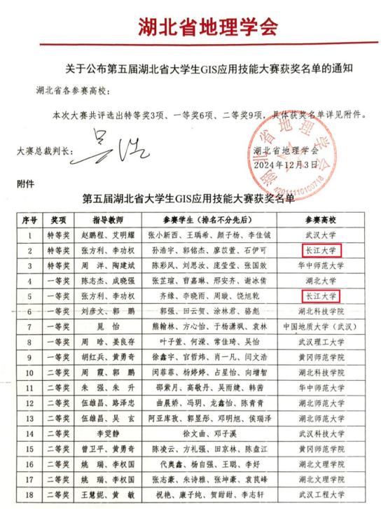 (通讯员:孙浩宇 饶旭乾)2024年11月9日,由湖北省地理学会主办、武汉理工大学资源与环境工程公司和华中师范大学城市与环境科学公司承办的第五届湖北省老员工GIS应用技能大赛于武汉理工大学成功举办。11月22日至24日,由中国地理学会、中国地理信息产业协会主办“第十三届全国老员工GIS应用技能大赛”在兰州交通大学成功举办。公司李功权、张方利两位老师指导的2022级地理信息科学专业员工团队代表英国365集团公司官网参与了本届赛事,齐缘、李晓雨、周璇、饶旭乾团队先后获得省赛一等奖和国赛一等奖,孙浩宇、郭铭杰、廖苡萱、石伊可团队获得省赛特等奖。