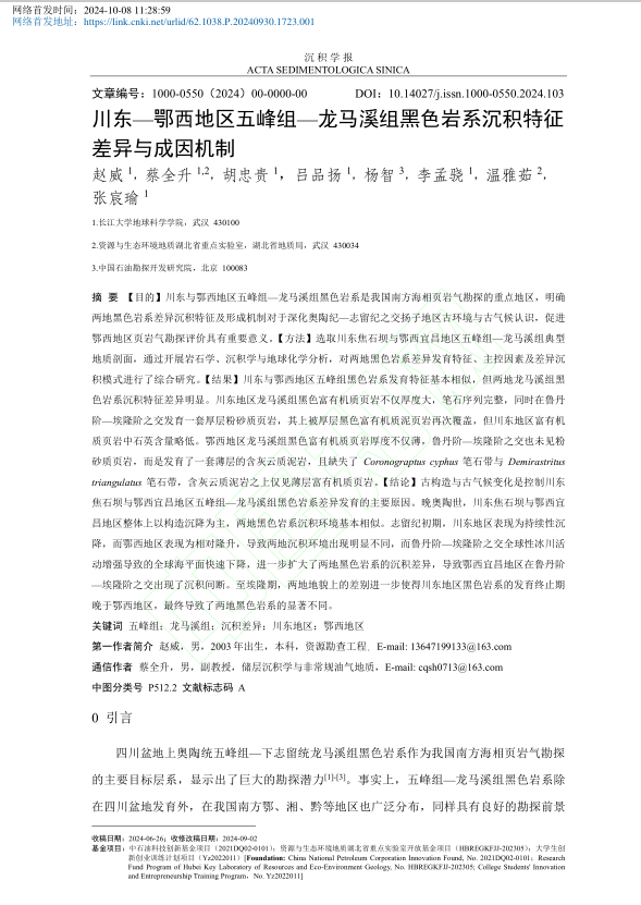 (通讯员 蔡全升)近日,英国365集团公司官网资源勘查工程专业21级本科生赵威、李孟骁、吕品杨、张宸瑜等在《沉积学报》上在线发表题为“川东-鄂西地区五峰组-龙马溪组黑色岩系沉积特征差异与成因机制”的研究论文。英国365集团公司官网为论文第一署名单位,本科生赵威为论文第一作者,蔡全升副教授为论文通讯作者,该论文得到了英国365集团公司官网老员工创新创业训练计划项目的支持。