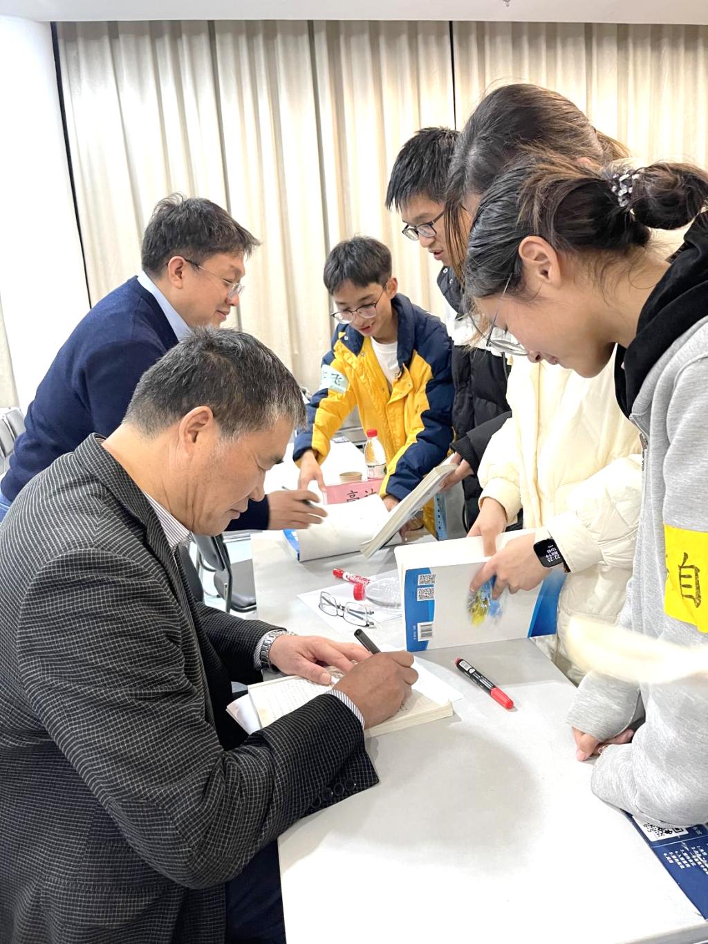比赛结束后,普地课程组老师依旧精心准备了自己撰写的地质专业书籍,现场为同学们签名赠书,不少同学还拿起自己的教材,争先恐后地请老师签名。老师们开心地与大家交谈,并在书上留下签名和“学习进步”的寄语。