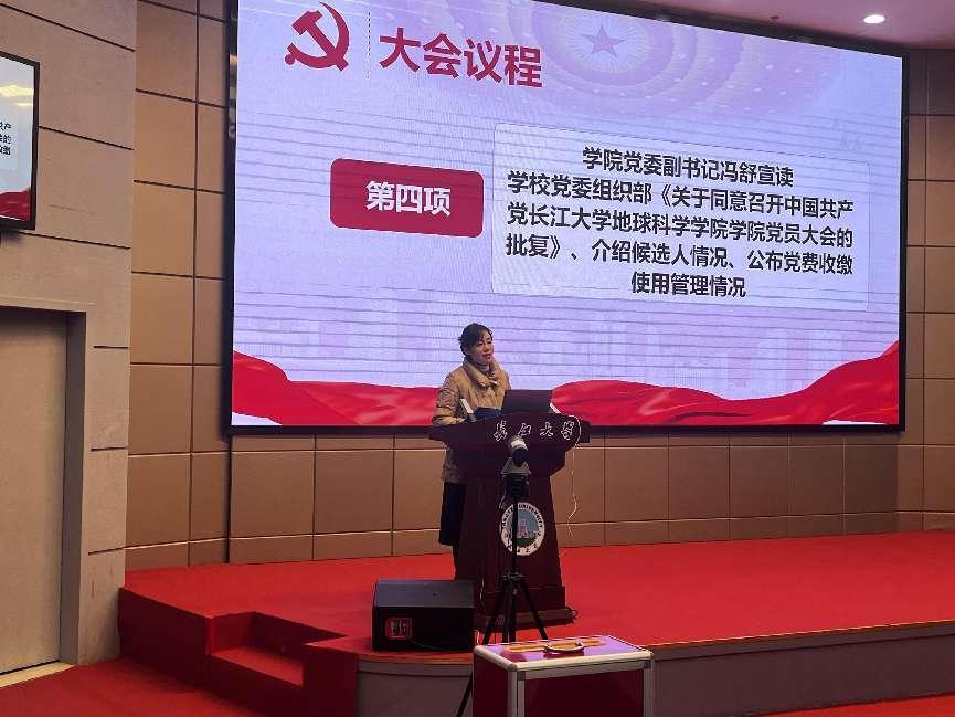 党委副书记冯舒同志宣读了公司党委《关于同意召开地球科学公司党员大会进行换届选举的批复》文件、介绍了候选人情况并公布了四年来公司党费收缴、管理和使用情况。全体党员审议并举手表决通过了选举办法、监票人、计票人建议名单。