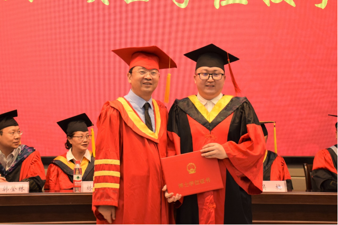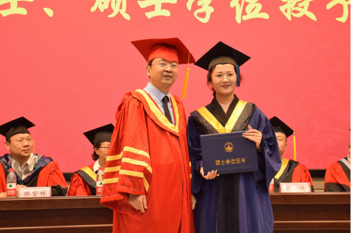 副书记任倩宣读《关于同意授予黎孟琦等270名同学学士学位的决定》,吴楠副经理宣读《关于同意授予张俊龙等105名同学硕士学位的决定》。胡明毅经理为获得学位的同学依次颁发学位证书,援正流苏并合影留念。