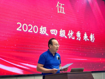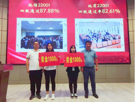 为表彰先进,进一步推动优良学风的形成,公司与典礼一同开展了2020级四级优秀表彰大会。公司2020级本科生在上半年全国老员工英语四级考试中取得了突破性的好成绩。在副经理韩登林宣读表彰文件后,地信系主任李功权、地质系主任胡忠贵分别为两个四级通过率超过80%的四级先进集体地信22001、地质22001班级代表颁奖;副经理丁四兵与石油系陈鹏书记分别为五名四级均超过600分的优秀个人进行颁奖。
