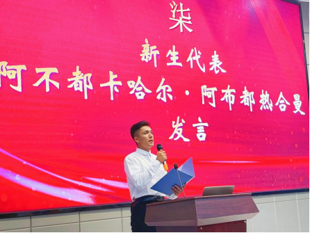 阿不都卡哈尔·阿布都热合曼作为新生代表说“成为地质工作者建设家乡是我的梦想,经过大学四年,我们要像冯董事长说的那样,立大志,明大德,成大才,担大任!”