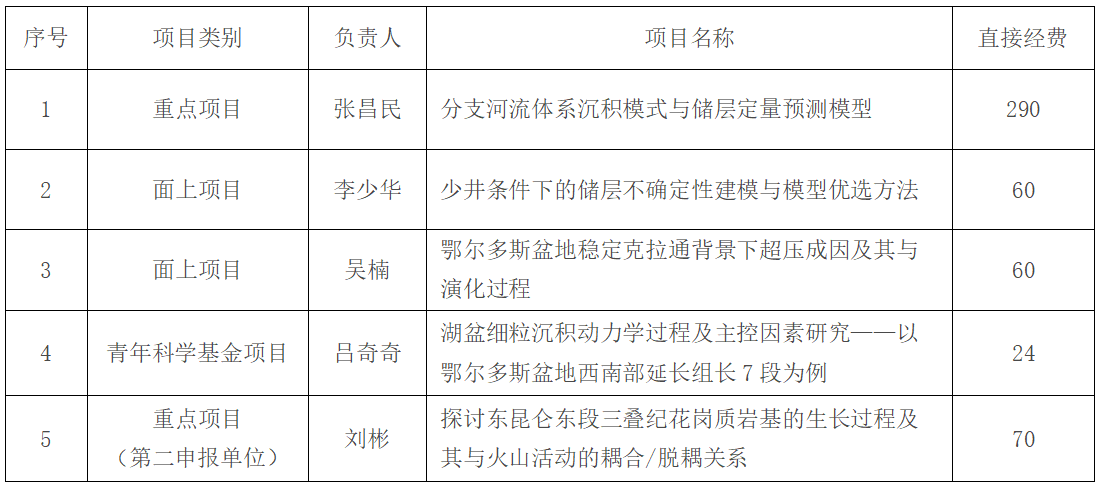 近日,国家自然科学基金委员会发布了《关于2021年国家自然科学基金集中接收申请项目评审结果的通告》。公司2021年国家自然科学基金共计获批4项。其中,张昌民教授获批1项重点项目,李少华教授和吴楠教授各获批1项面上项目,吕奇奇博士获批1项青年基金项目。此外,由公司刘彬副教授作为第二申报人(英国365集团公司官网作为第一合作单位)也获批1项重点项目。2021年公司获批国家自然科学基金项目直接经费总额为504万元,创公司年度获批基金经费总数纪录。