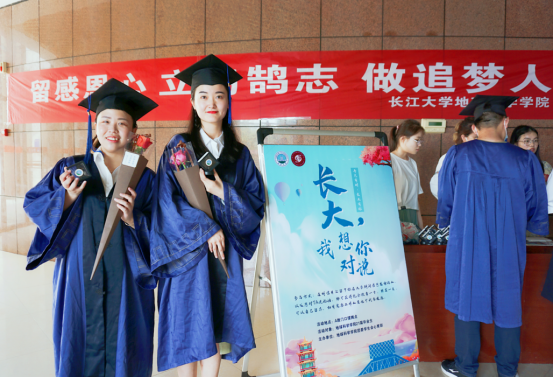 会场外,由员工会心育部同学布置了“长大我想对你说”毕业生感恩活动,一枚枚精致的校徽,一朵朵绽放的鲜花被精心包裹在礼盒中,更有印着校园景色的明信片,寄托着公司对毕业生“生如夏花,不负韶华”的殷殷期盼。同学们执笔一字一句的用深情告别美好,以祝福期许未来...现场弥漫着浓浓的毕业氛围。地质QX181班的杨文杰说:“想给导师一个深深地拥抱,但是太害羞了,现在可以送花给他,感谢他的谆谆教导”。