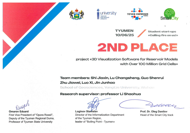 公司十分重视员工国际化视野的培养,给员工积极创造条件参加国际化学科竞赛。在李少华教授的指导下,由石佳鑫、卢昌盛、郭申锐、朱家为、罗玺、金俊浩六位同学组成的“超级维度”创新团队,在2025年国际员工创新创业大赛中,凭借其自主研发的、能够解决行业关键难题的“亿级网格油藏模型三维可视化软件”,一路过关斩将,最终荣获亚军。