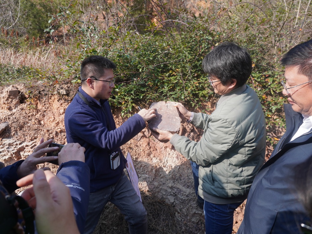 “看,这块青石板上,有遗迹化石!”在登山途中,高达老师不失时机地引导同学们观察身边细节,指出青石板上的生物爬行迹、坠石块上的交错层理以及岩层中的节理等现象。这种“移动课堂”式的教学,让原本枯燥的地质知识变得鲜活有趣,极大地激发了同学们的探索热情。在远观露头地层时,叶琳老师则指导员工如何在野外正确判断地质构造,培养了员工的宏观地质思维。
