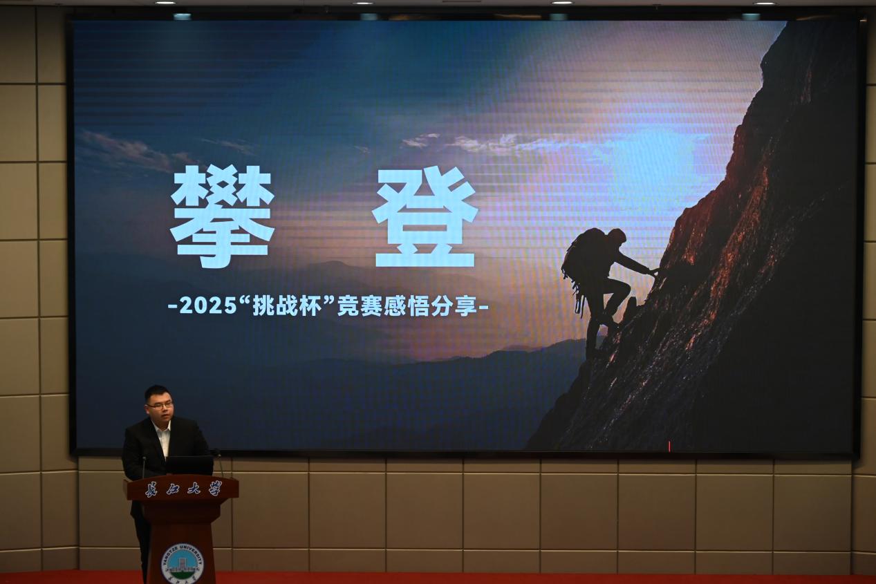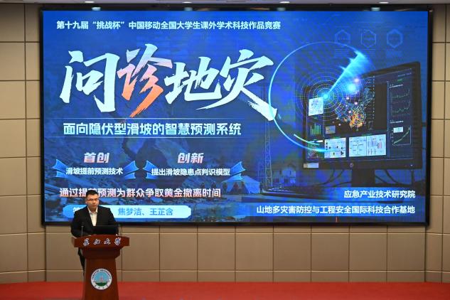 “挑战杯”国赛获奖团队代表韩亚玲、黄迟君、陈思钰、王芷含现场展示了国赛风采。《问诊地灾》团队作为本年度全校唯一进入主赛道现场的队伍,团队代表王芷含,以“攀登”为题,真诚分享了团队备赛到获奖的心路历程,当他坚定的说出:“没关系,试一试,总能找到办法”时,现场师生响起了热烈的掌声。党宇烁同学感慨道:“同学们展现出的专业能力和拼搏精神让我倍感振奋,我将以他们为标杆,不断锤炼自己。”