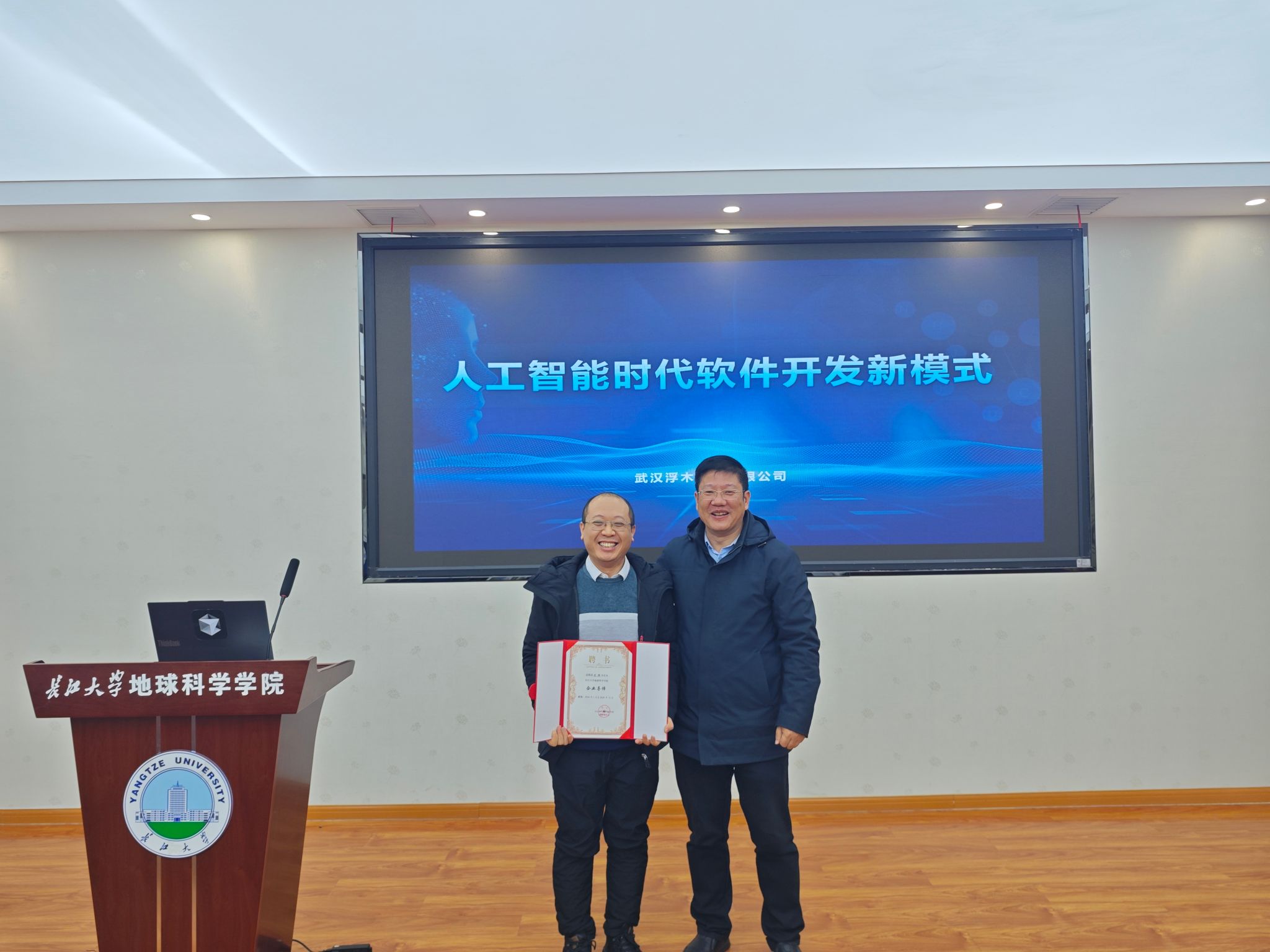 (通讯员 井然)2026年1月5日,“企业导师面对面:人工智能时代软件开发新模式”专题讲座在石油科技大楼C301会议室成功举行。武汉浮木科技有限公司副总经理刘鹏应邀作为主讲嘉宾,为公司地信系师生带来了一场关于AI驱动软件开发的技术报告。公司副经理胡忠贵、地信系主任刘远刚、地信系副主任井然以及地理信息科学专业产业班全体本科生参与了此次交流。报告会由刘远刚主任主持。