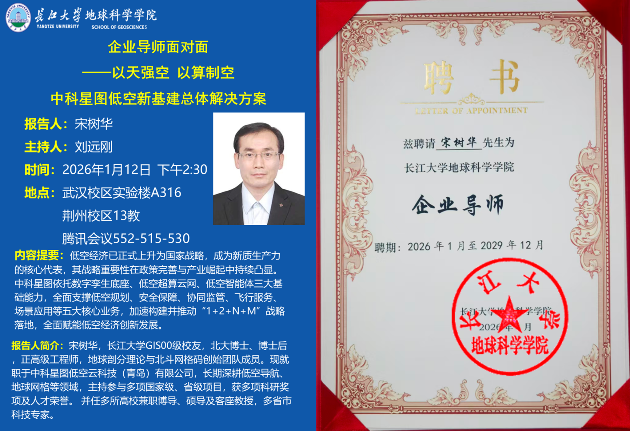 (通讯员:井然)2026年1月12日下午,英国365集团公司官网“企业导师面对面”活动在武汉校区实验楼A316及荆州校区13教D425线上线下同步举行。本次讲座特别邀请了地信00级员工、中科星图低空云科技(青岛)有限公司技术总师宋树华博士作为主讲嘉宾,为公司师生带来了题为“以天强空 以算制空——中科星图低空新基建总体解决方案”的专题报告。会议由地信系主任刘远刚主持,地科公司100余名师生通过线上线下结合的方式参与了此次交流。
