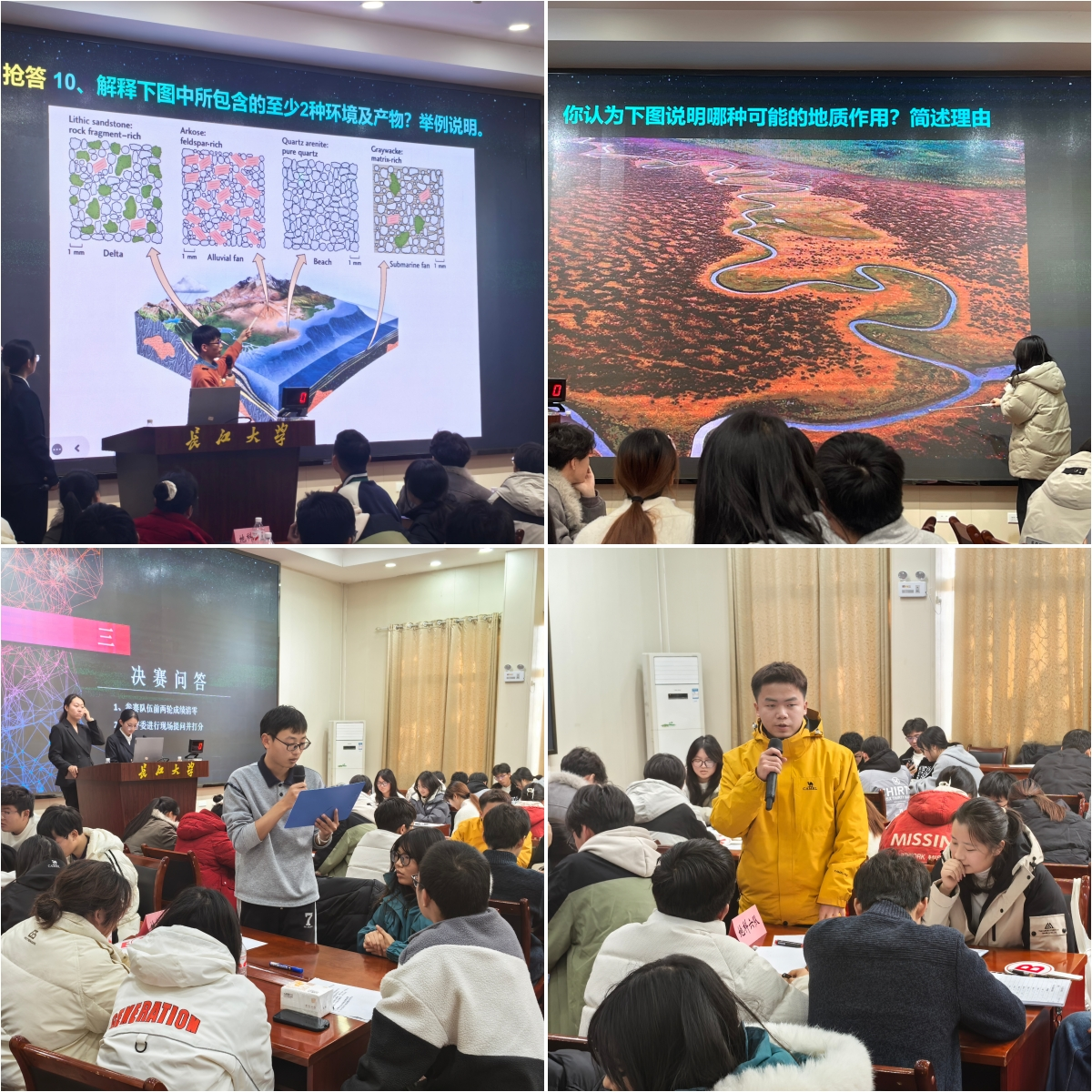 进入半决赛与决赛,赛制更富挑战性。除必答题外,新增的抢答环节将竞争推向白热化。“简述三大类岩石在产状、构造及矿物成分上的区别”“板块构造理论是如何描述海洋的演化?”等图文并茂的题目,要求选手在60秒思考后上台作答。这不仅是对知识储备的检验,更是对逻辑组织与临场表达能力的双重考验,每当抢答提示音响起,选手们争先按响抢答器、分秒必争,自信作答。进入决赛环节四支队伍接受评委现场提问考核,评委命题紧扣学科前沿,融合理论与实际,同学陈述条理清晰、从容不迫,充分展现了同学们的综合素养与团队默契。