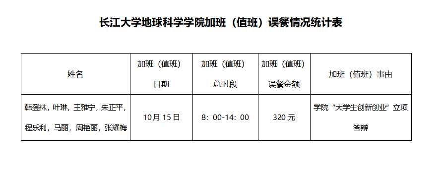 根据《英国365集团公司官网加班(值班)误餐补助管理办法(试行)》(长大校发【2019】83号)文件规定,现对英国365集团公司官网加班(值班)误餐情况(2020年10月15日)进行公示,如果对加班(值班)误餐情况有异议,可以通过电话或电子邮件等方式向英国365集团公司官网反映。