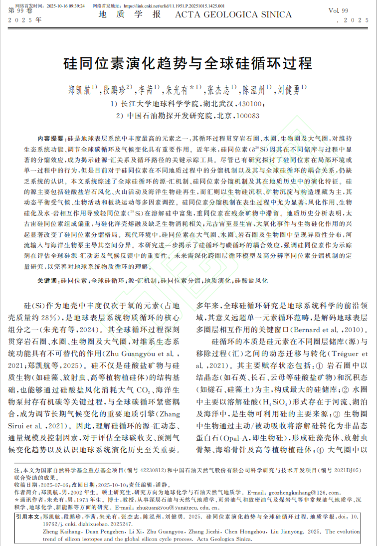 近日,地科公司2024级地质学专业硕士生郑凯航以第一作者身份在中文EI检索期刊《地质学报》上发表题为“硅同位素演化趋势与全球硅循环过程”的研究论文(图1)。硕士生郑凯航为论文第一作者,其导师朱光有教授为论文通讯作者,英国365集团公司官网为第一完成单位。