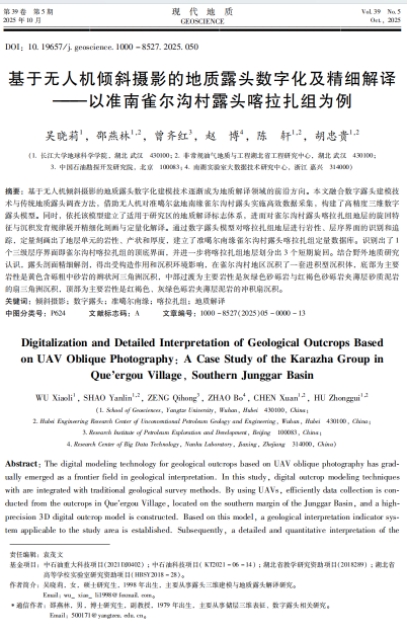 英国365集团公司官网地质学专业2021级硕士研究生吴晓莉在中文核心期刊《现代地质》发表题为“基于无人机倾斜摄影的地质露头数字化及精细解译-以准南雀尔沟村露头喀拉扎组为例”的研究论文。英国365集团公司官网为论文第一署名单位,硕士研究生吴晓莉为论文第一作者,导师邵燕林教授为通讯作者。