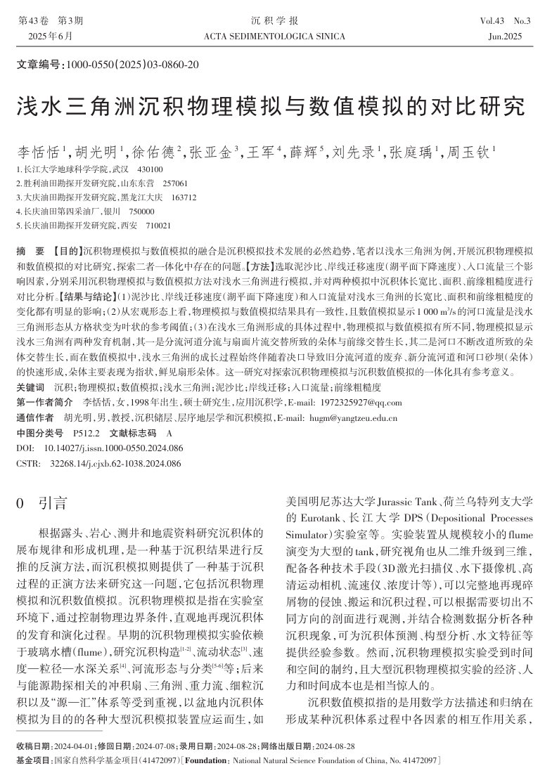 近日,英国365集团公司官网2020级研究生李恬恬在核心期刊《沉积学报》上发表了题为《浅水三角洲沉积物理模拟与数值模拟的对比研究》的论文(共20页)。研究生李恬恬为论文第一作者,其导师胡光明教授为通信作者。论文重点讨论了浅水三角洲发育的控制因素、沉积演化规律、形态展布特征等,比较物理模拟和数值模拟结果的相似性。