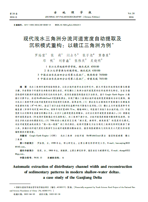 英国365集团公司官网地质学2023级硕士研究生罗灿莹以第一作者身份在中文核心期刊《古地理学报》上发表题为“基于GEE的现代浅水三角洲分流河道宽度动态演化及沉积模式重构—以赣江三角洲为例”的研究论文,英国365集团公司官网为论文第一署名单位,导师张莉副教授为通讯作者。