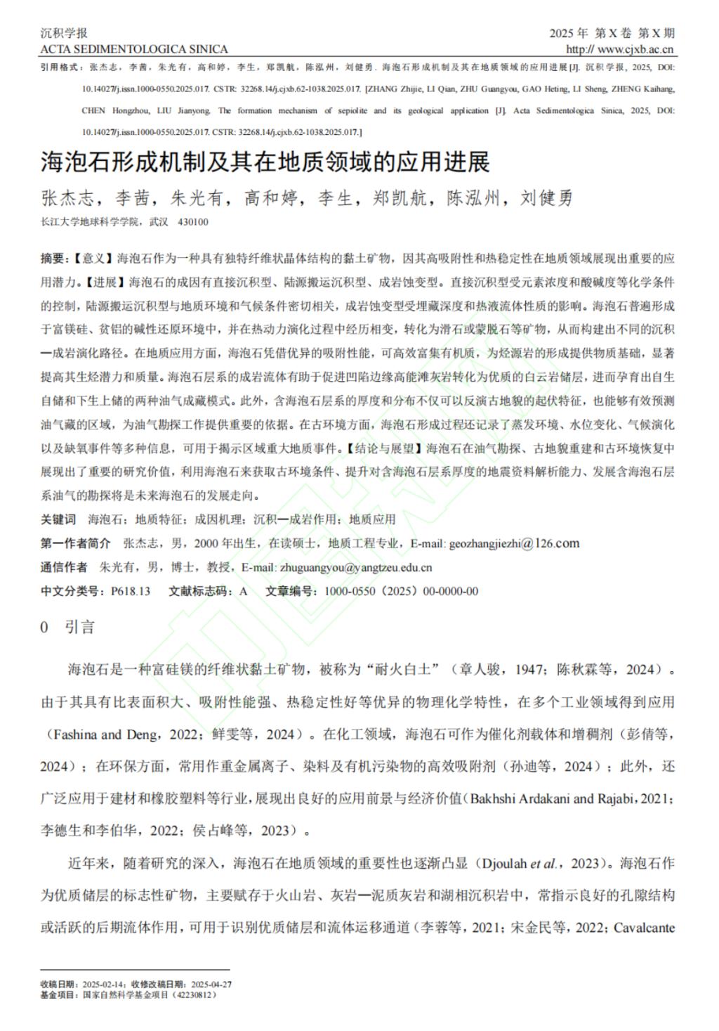 近日,英国365集团公司官网24级研究生张杰志在核心期刊《沉积学报》上发表了题为《海泡石形成机制及其在地质领域的应用进展》的论文(共32页)。全部作者均来自英国365集团公司官网师生,研究生张杰志为论文第一作者,其导师朱光有教授为通信作者。论文重点讨论了海泡石的地质特征、成因机制、沉积—成岩的关系以及在地质领域的应用。