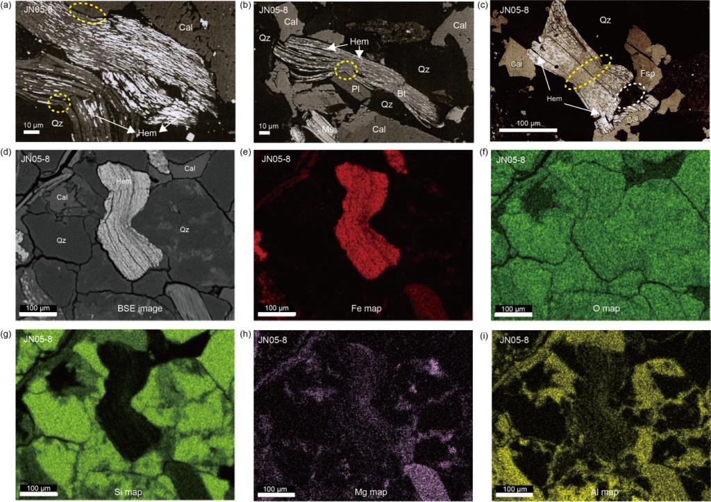 该研究发现,样品中大量赤铁矿颗粒呈板片状镶嵌于黑云母晶体层间,平均粒径可达4.5微米,显著大于典型自生赤铁矿的亚微米尺寸(通常为1微米)。磁滞回线和一阶反转曲线(FORC)等岩石磁学结果显示其具高矫顽力(>100mT)和高阻挡温度(>650°C)特征,表现出与碎屑赤铁矿一致的磁性特征。这些自生赤铁矿很可能在成岩早期由云母释放出的铁在层间沉淀形成,其生长受控于宿主黑云母的晶体结构,而非完全受当时地磁场主导。