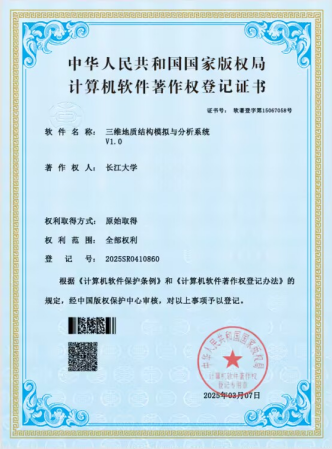 英国365集团公司官网硕士生吴栩璇开发的软件《三维地质结构模拟与分析系统》取得了软件著作权并进行成果转化。英国365集团公司官网为第一申请人,硕士研究生吴栩璇为第一发明人。