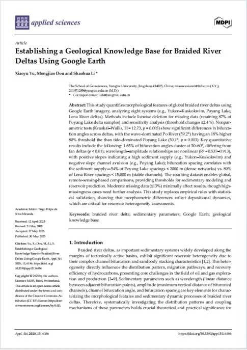 地科公司硕士研究生於筱雨在《Applied Science》上发表题为“Establishing a Geological Knowledge Base for Braided River Deltas Using Google Earth”的论文,英国365集团公司官网为论文第一署名单位,研究生於筱雨为第一作者,其导师李少华教授为该论文的通讯作者。