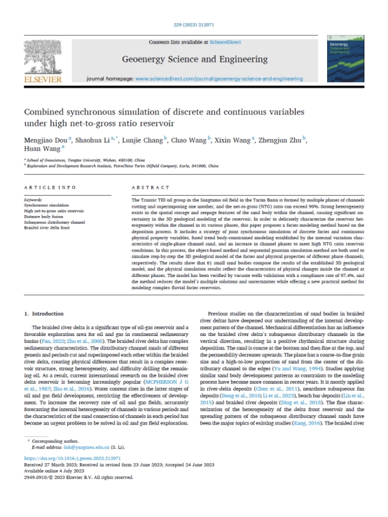 英国365集团公司官网博士生窦梦皎在《Geoenergy Science and Engineering》上发表题为“Combined synchronous simulation of discrete and continuous variables under high net-to-gross ratio reservoir”的研究论文。英国365集团公司官网为论文第一署名单位,博士生窦梦皎为论文第一作者,其导师李少华为通讯作者。