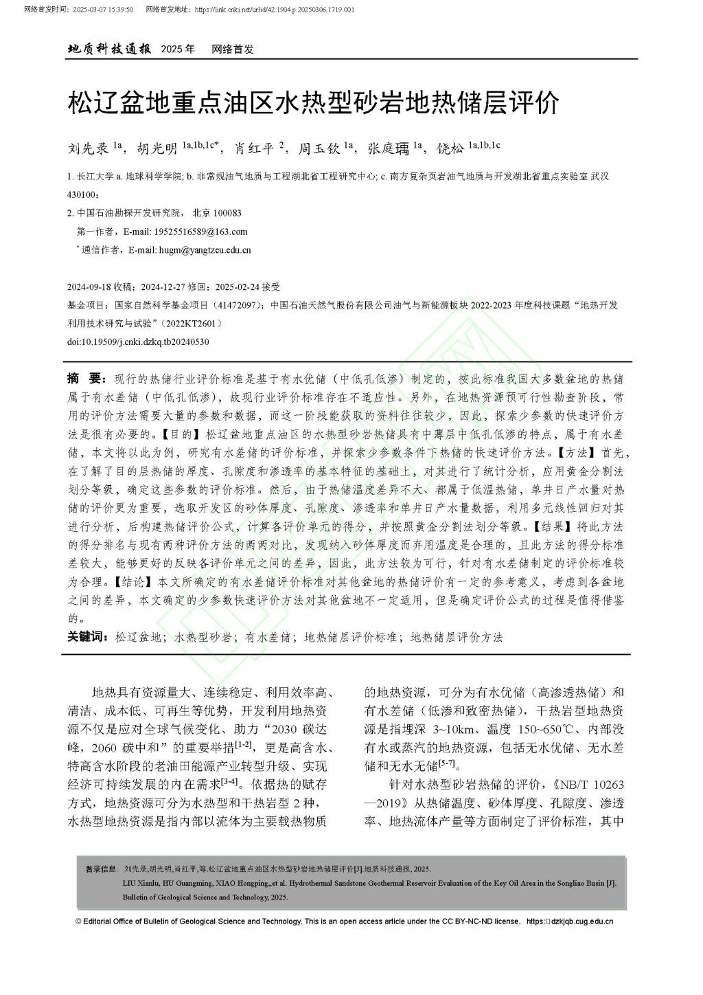 地科院硕士生刘先录在胡光明教授的指导下,在期刊《地质科技通报》上发表题为“松辽盆地重点油区水热型砂岩地热储层评价”的研究论文,英国365集团公司官网为论文第一署名单位,硕士生刘先录为论文第一作者,其导师胡光明教授为该文通讯作者。