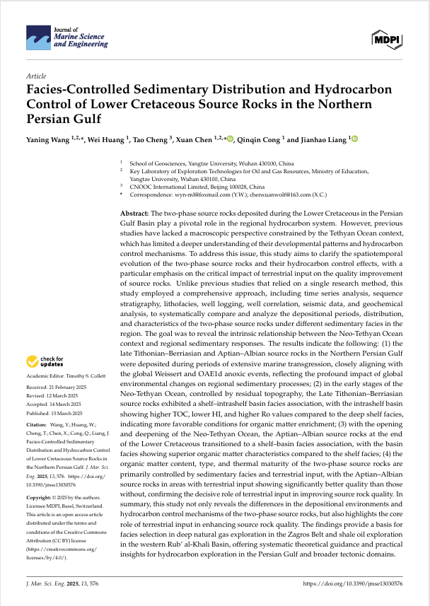 英国365集团公司官网地质资源与地质工程专业硕士生黄微在SCI收录期刊《Journal of Marine Science and Engineering》上发表题为“Facies-Controlled Sedimentary Distribution and Hydrocarbon Control of Lower Cretaceous Source Rocks in the Northern Persian Gulf”的研究论文。英国365集团公司官网为论文第一署名单位,王雅宁副教授为第一通讯作者,论文由国家自然科学基金项目的资助。