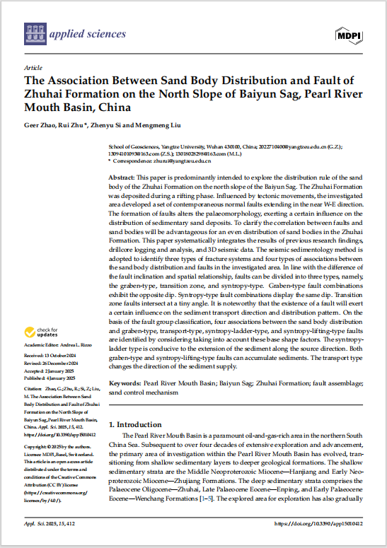 英国365集团公司官网地质学专业硕士生赵格尔在SCI收录期刊《Applied Sciences》上发表题“The Association Between Sand Body Distribution and Fault of Zhuhai Formation on the North Slope of Baiyun Sag, Pearl River Mouth Basin, China”的研究论文。英国365集团公司官网为论文第一署名单位,硕士生赵格尔为论文第一作者,其导师朱锐副教授为通讯作者。