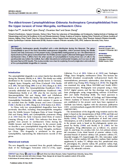 英国365集团公司官网地质学专业硕士研究生范桂君同学在公司肖传桃教授、中科院南京地质古生物研究所郑大燃研究员的共同指导下,在地球科学与古生物学领域期刊《Historical Biology》上发表题为“The oldest-known Cymatophlebiinae (Odonata:Aeshnoptera: Cymatophlebiidae) from the UpperJurassic of Inner Mongolia, northeastern China”的研究论文。