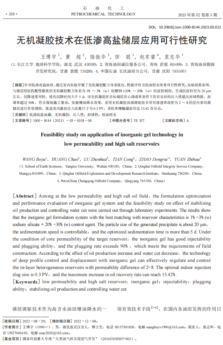 地科公司博士生王博宇在《石油化工》上发表题为《无机凝胶技术在低渗高盐储层应用可行性研究》的论文。英国365集团公司官网为论文第一署名单位,博士生王博宇为论文第一作者,袁志华为通讯作者。