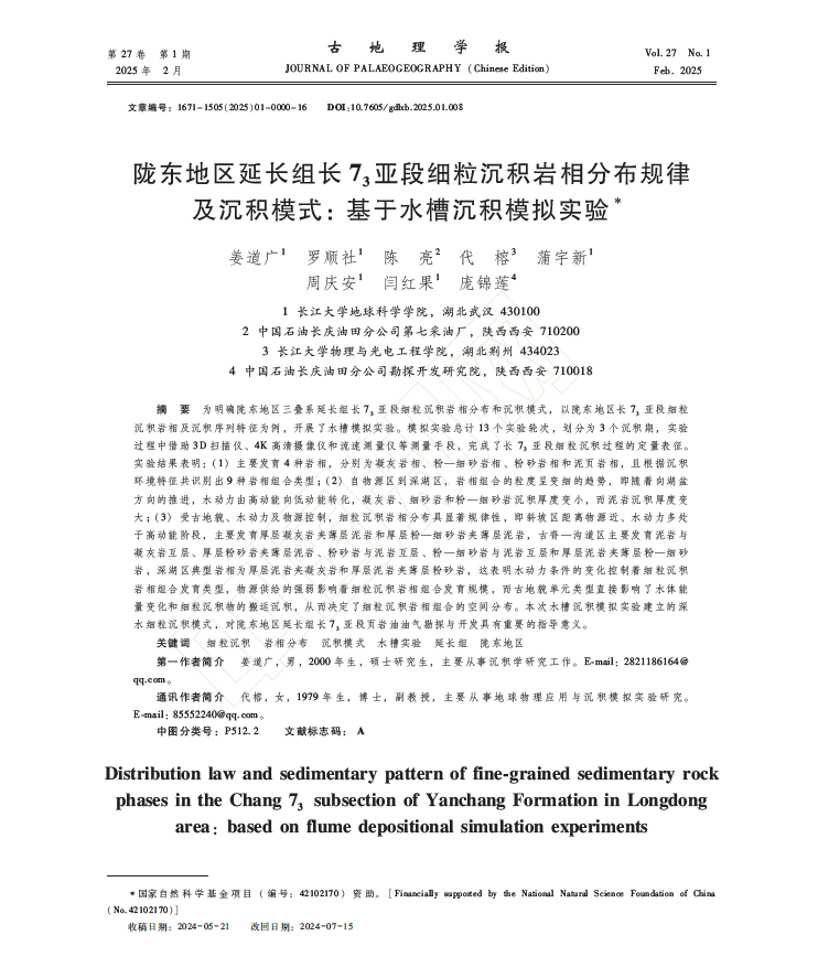 地科公司硕士生姜道广在《古地理学报》上发表题为“陇东地区延长组长73亚段细粒沉积岩相分布规律及沉积模式:基于水槽沉积模拟实验”的研究论文。该论文,以陇东地区长73亚段细粒沉积岩相及沉积序列特征为例,开展了水槽模拟实验并借助3D扫描仪、4K高清摄像仪和流速测量仪等测量手段,完成了长73亚段细粒沉积过程的定量表征。