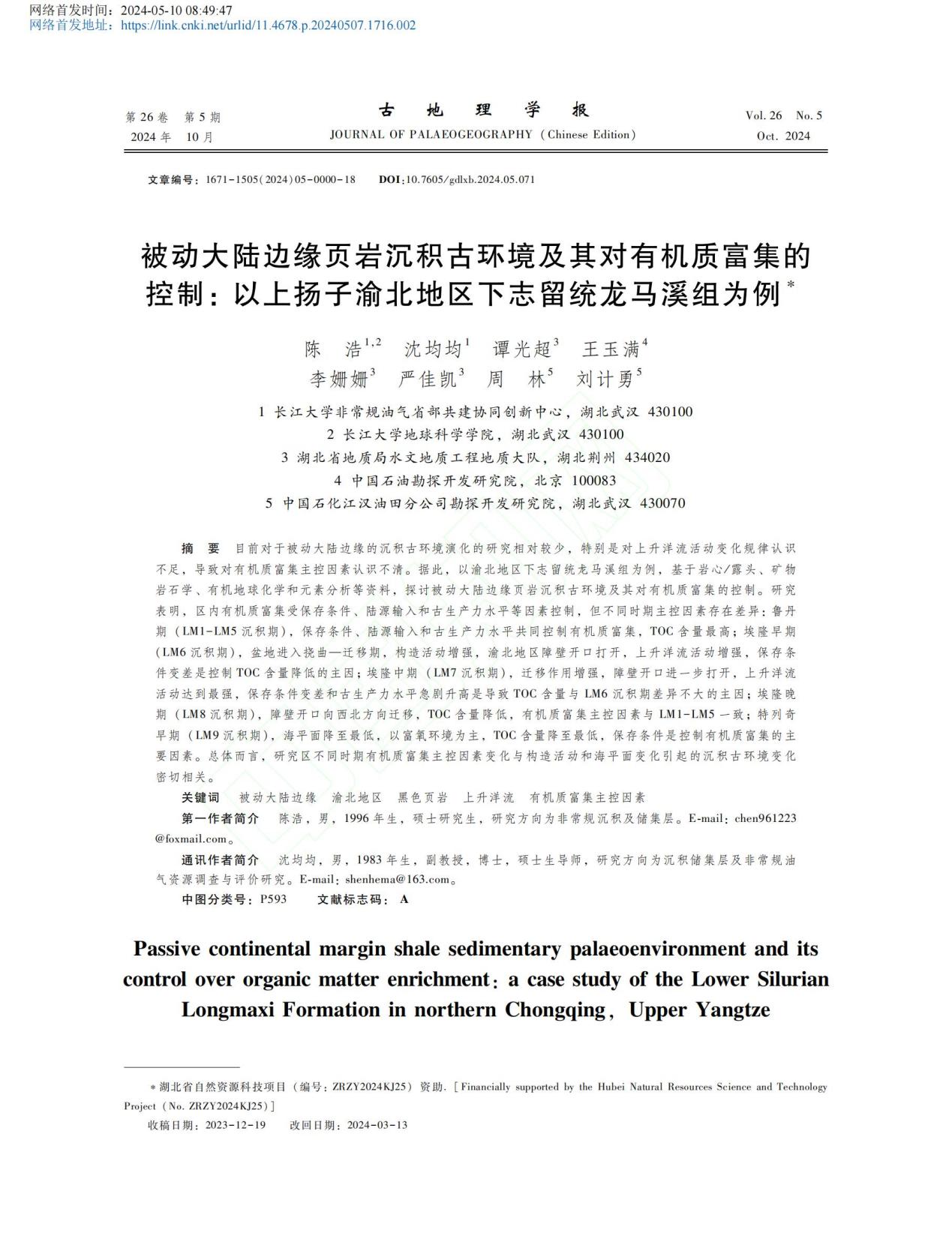地科公司研究生陈浩以第一作者身份在北大核心期刊《古地理学报》上发表题为“被动大陆边缘页岩沉积古环境及其对有机质富集的控制:以上扬子渝北地区下志留统龙马溪组为例”的研究论文,英国365集团公司官网非常规油气省部共建协同创新中心和英国365集团公司官网为论文第一署名单位。副教授沈均均为通讯作者。
