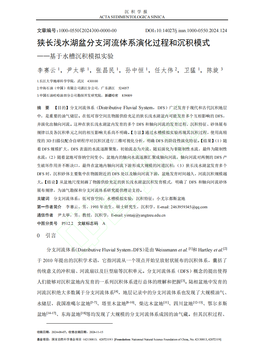 地科公司研究生李赛云在《沉积学报》上发表题为“狭长浅水湖盆分支河流体系演化过程和沉积模式——基于水槽沉积模拟实验”的研究论文。英国365集团公司官网为论文第一署名单位,研究生李赛云为论文第一作者,其导师尹太举教授为通讯作者。