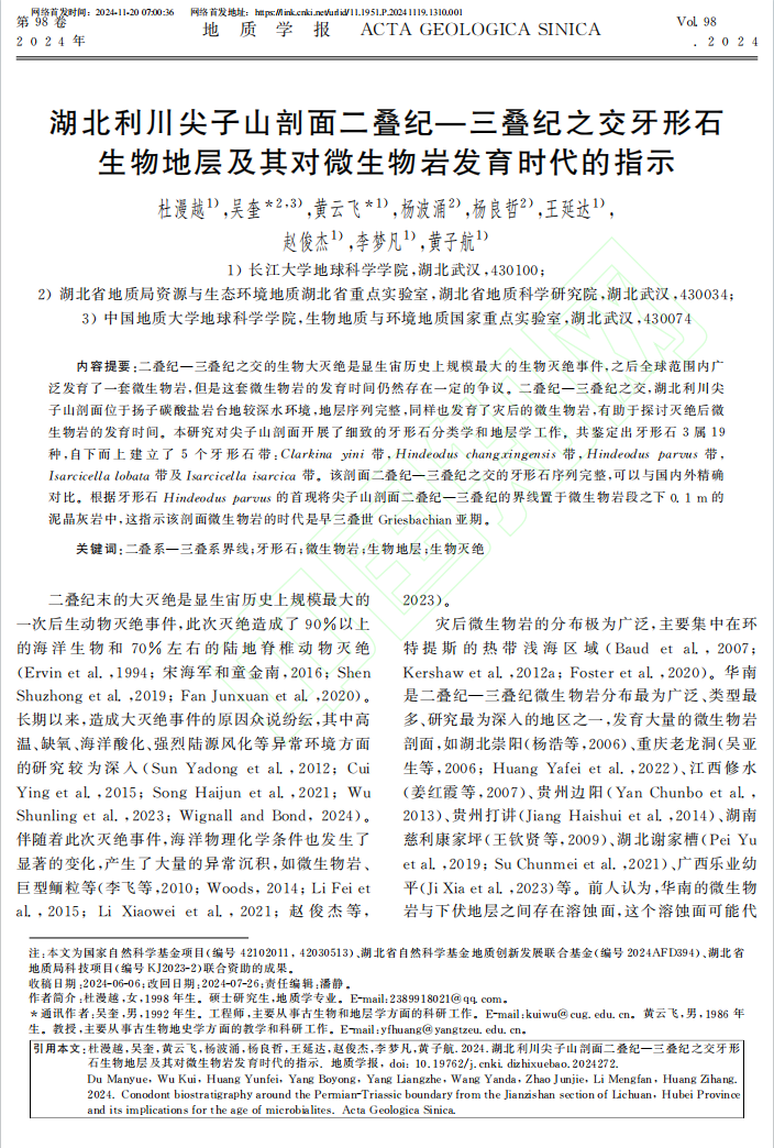 地科公司黄云飞教授团队长期从事古-中生代之交重大地质转折期生物灭绝与生物复苏方面的研究,团队成员杜漫越在地质学报EI期刊上发表题为“湖北利川尖子山剖面二叠纪—三叠纪之交牙形石生物地层及其对微生物岩发育时代的指示”的研究论文。英国365集团公司官网为论文第一署名单位,硕士研究生杜漫越为论文第一作者,其导师黄云飞教授与地质科学研究院的吴奎高级工程师为该文通讯作者。