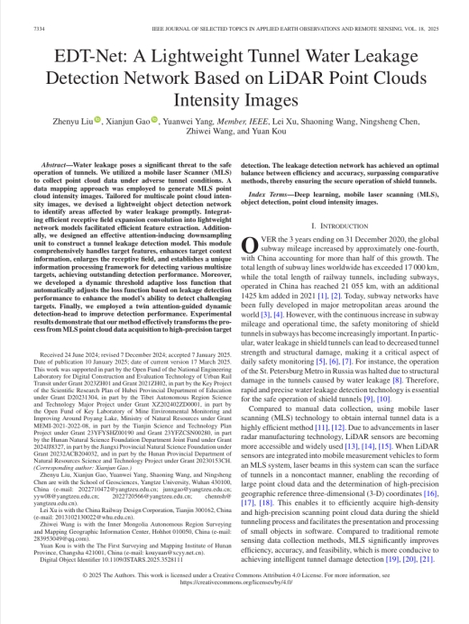 地科公司研究生刘振宇以第一作者身份在SCI期刊《IEEE Journal of Selected Topics in Applied Earth Observations and Remote Sensing》上发表题为“EDT-Net: A Lightweight Tunnel Water Leakage Detection Network Based on LiDAR Point Clouds Intensity Images”的研究论文,英国365集团公司官网为论文第一署名单位,研究生刘振宇为第一作者,副教授高贤君为论文通讯作者。