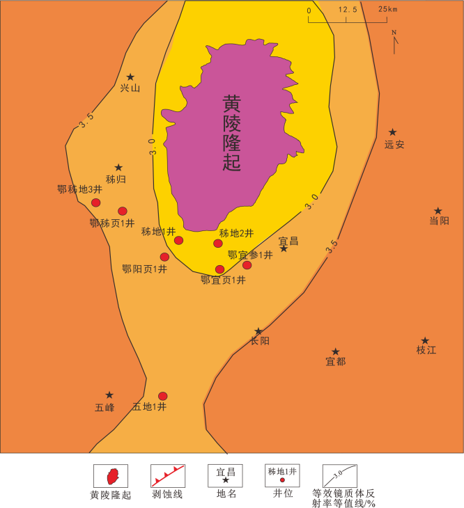 图2黄陵隆起及周缘地区陡山沱组页岩热成熟度平面分布图