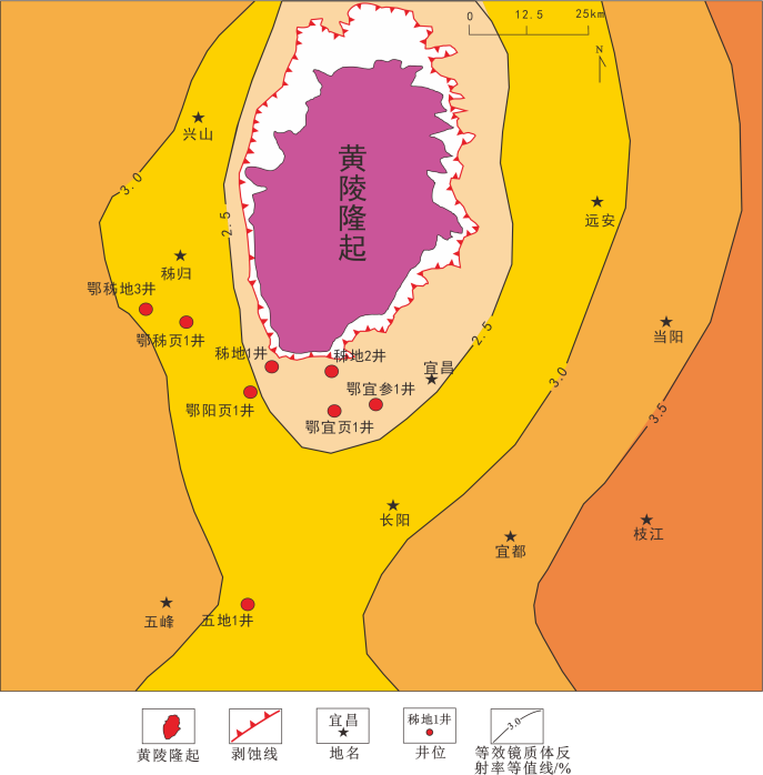 根据对样品固体沥青和笔石表皮体光学特征的研究,陡山组和牛蹄塘组页岩中,固体沥青反射率和激光拉曼参数光谱两种评价指标均能评价页岩的成熟度。五峰-龙马溪组页岩中,固体沥青反射率的相对误差较大,因此采用笔试表皮体反射率和激光拉曼光谱参数评价页岩的成熟度。综合三种评价指标得出陡山组页岩的 EqVRo为 2.88%~3.81%、牛蹄塘组页岩EqVRo 为 2.44%~3.41%、五峰-龙马溪组的 EqVRo为 1.75%~2.82%。页岩热成熟度平面规律绕背斜核部呈现放环状分布,靠近背斜核部成熟度逐渐降低。通过等效镜质体反射反算出黄陵隆起核部边缘地层所经历最高古地温为 200℃左右,佐证黄陵隆起形成时间应为晚侏罗世-早白垩世。