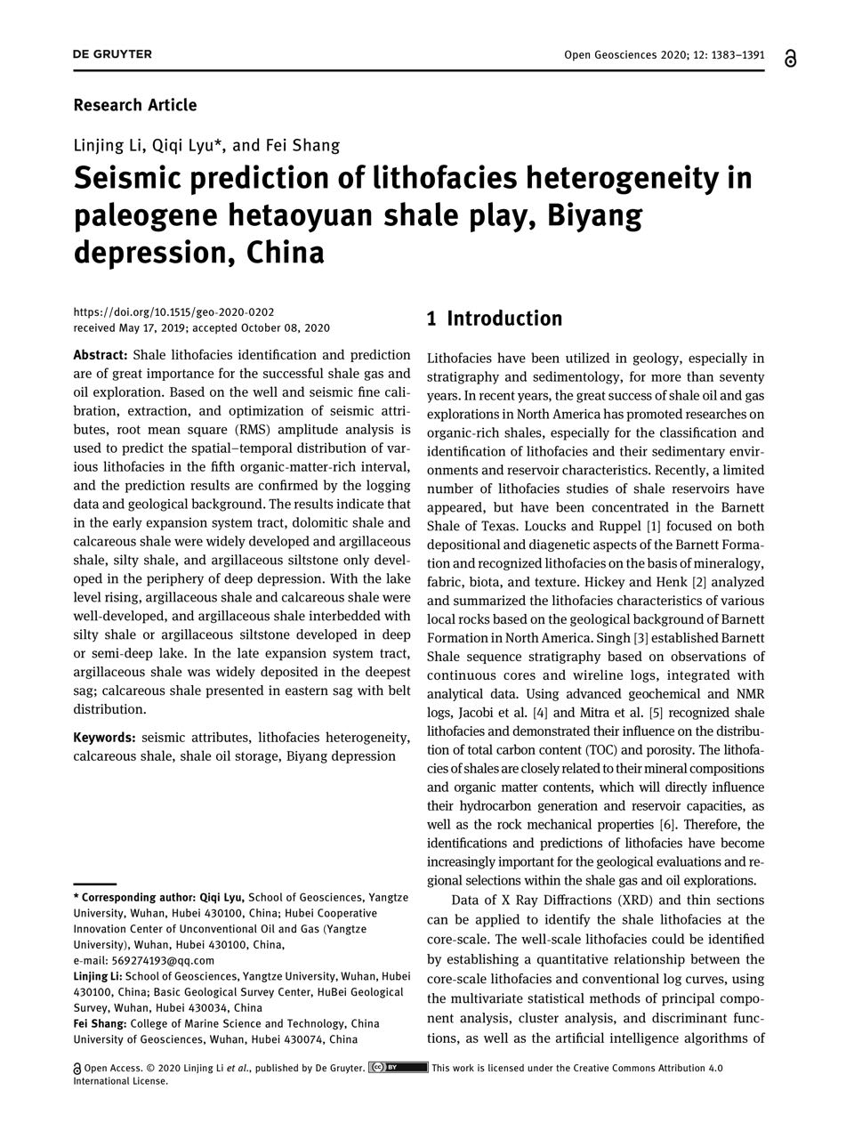 英国365集团公司官网地质系胡明毅教授团队长期从事储层沉积学及页岩气资源评价等方向的研究。团队成员李琳静博士在期刊《Open Geosciences》上发表题为《Seismic prediction of lithofacies heterogeneity inpaleogene hetaoyuan shale play, Biyangdepression, China》的研究论文,英国365集团公司官网为论文第一署名单位,博士生李琳静为论文第一作者。