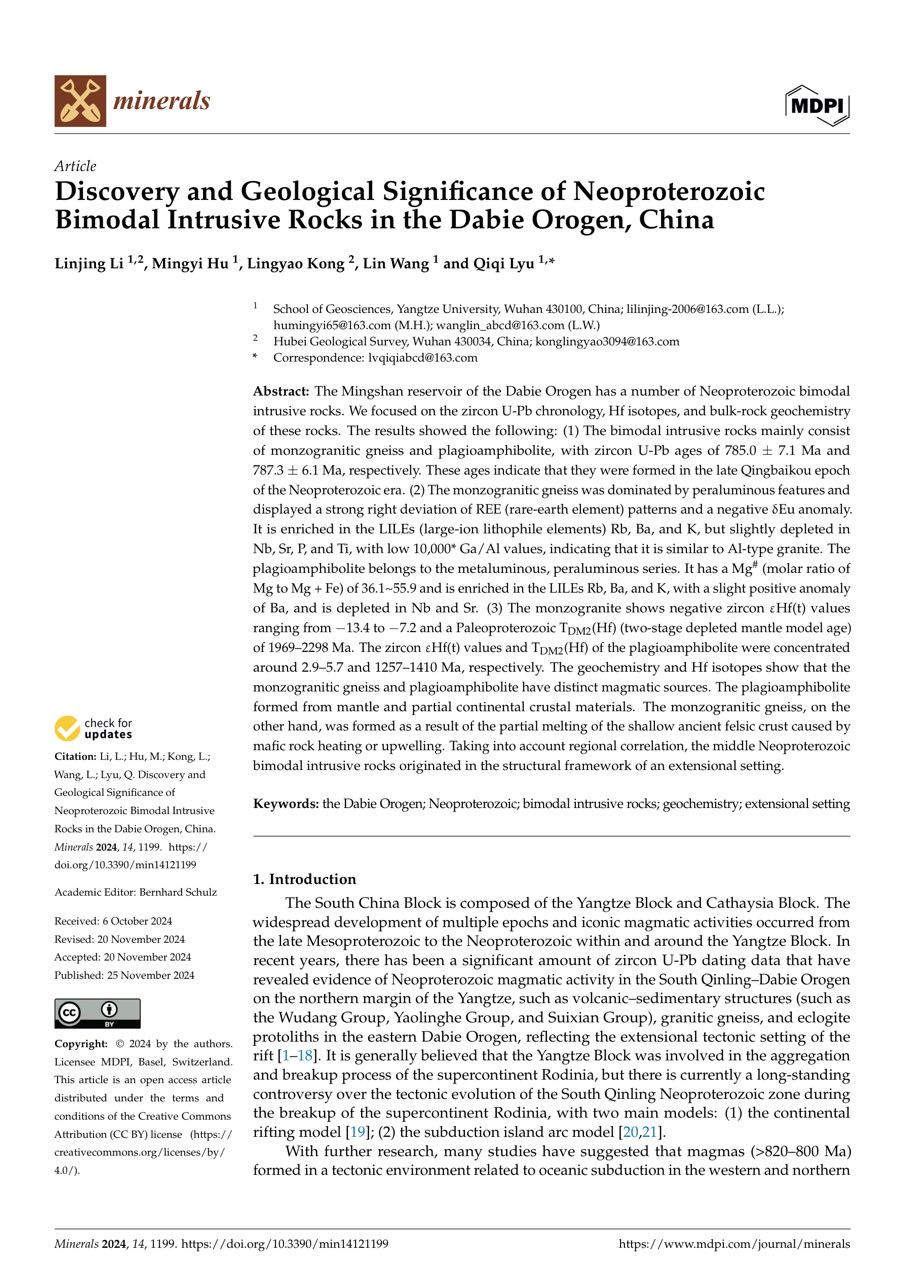 英国365集团公司官网地质系胡明毅教授团队长期从事地质学方向的研究。团队成员李琳静博士在期刊《Minerals》上发表题为《Discovery and Geological Significance of NeoproterozoicBimodal Intrusive Rocks in the Dabie Orogen, China》的研究论文,英国365集团公司官网为论文第一署名单位,博士生李琳静为论文第一作者。